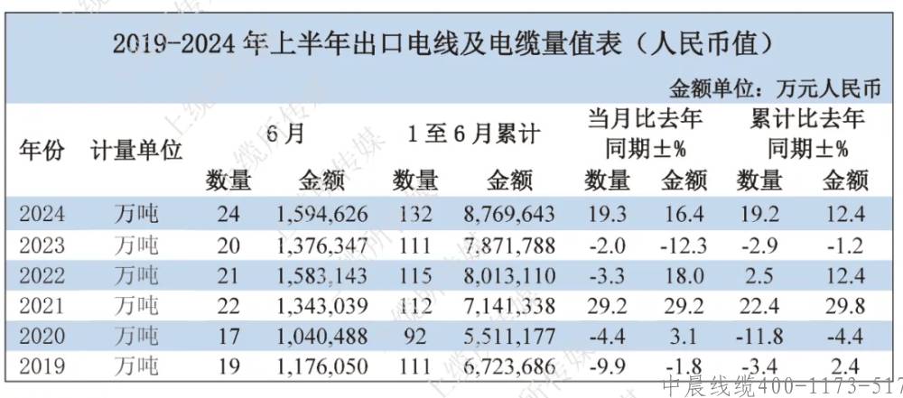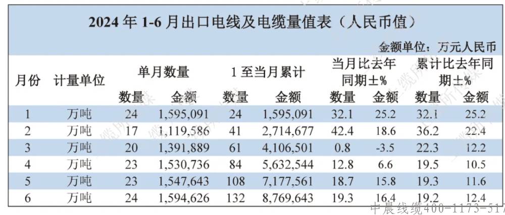 海關(guān)總署最新公布的數(shù)據(jù)顯示,2024年6月我國電線電纜共出口24萬噸,同比增長19.3%;出口金額為159.5億元,同比增長16.4%。2024年1-6月,我國電線電纜累計(jì)共出口132萬噸,累計(jì)同比增長19.2%;出口金額為877.0億元,累計(jì)同比增長12.4%。