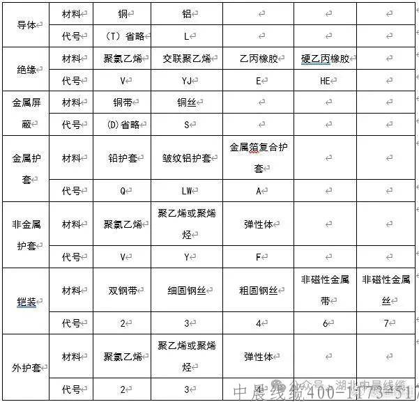 以下是電力電纜各部分結(jié)構(gòu)材料的代號